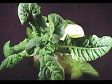 | 葉萵苣缺鋅。新葉變小、皺縮,葉形變鈍,呈叢生狀,葉色灰綠,下位葉黃化。 |