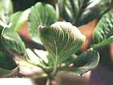 | 油菜缺鋅。新葉變小、變厚,葉色濃綠,葉片向內、外捲曲。 |