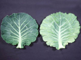 正常(左)與缺鋅之甘藍葉片。缺鋅之甘藍葉片,葉肉黃白化。 |