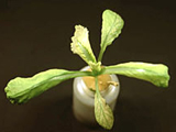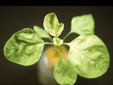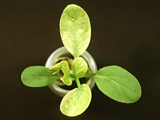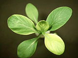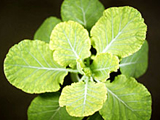 嚴重缺鐵之油菜。下位葉維持正常,新葉黃化。 |