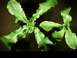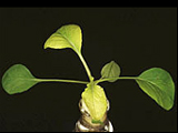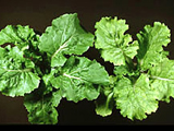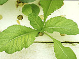 | 嚴重缺鐵之芥菜。新葉黃白化,黃化現象易擴及下位葉片。 |