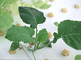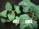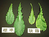 | 正常與缺鐵之芥藍。缺鐵之芥藍新葉呈細網狀之黃化,下位葉維持正常,生育緩慢。 |