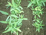 | 田間蕹菜缺鐵。下位葉維持正常,新葉黃白化。 |