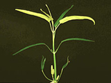 莧菜缺鐵。新葉黃白化,黃白化現象自葉片基部開始漸擴及葉肉。 |