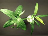 嚴重缺鐵之蕹菜。下位葉維持正常,新葉(含新梢分蘗葉片)呈亮黃色之黃化。 |