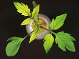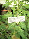| 嚴重缺鐵之蕃茄苗。新葉除主脈及支脈附近維持綠色外,葉肉黃化,黃化現象由葉片基部向下擴展。 |