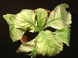 | 青江菜缺鐵。新葉黃白化,黃化現象自葉緣向內擴展,下位葉維持正常。 |
