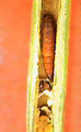 赤褐色,甫化蛹時呈淡綠色,紡錘狀,末端具尾刺兩枚,體長約為11公厘。 |