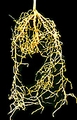 根腐病與幼苗疫病:柑橘根部被疫病菌危害時,稱為根腐病。細根、支根及主根均可被害。受害之根系表皮脫落、腐敗,生育停頓,被害之粗根褐變、流膠,而沾黏土壤顆粒。病害輕微時,地上部無明顯病徵;嚴重時,出現葉片黃化、落葉,生育停頓,全株萎凋、死亡。幼苗較感病,常出現整區幼苗黃化枯萎,而在連續降雨後,整畦柑苗可能急速萎凋枯死。