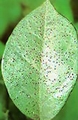 在葉片、嫩枝條及果實上,形成突出密集的小黑點,用手觸摸,有粗糙的感覺。果實上病徵,隨病原菌孢子感染濃度的高低及感染果實時期不同而表現不同(如下表)。雨水中孢子密度低時,在果實上產生小黑點;如孢子密度高,則形成淚斑或赤褐色泥塊狀病斑;而嫩葉受到密度很高的孢子感染,會產生密集的赤黑色斑點。不同齡期的果實染病時表現的病徵不同,當病原菌孢子侵入幼果皮或嫩葉時,侵入部位會形成抵抗組織,把病菌包圍,而產生突起的小黑點或斑點。果實經過增大期以後,果皮本身的再生能力弱,因此在此時期受病菌感染,只會變色而不會突起隆起。因此,由果實病徵可推測感染時期及病原菌密度。