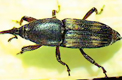 成蟲: 暗褐色,體長5.5-7.1公厘,寬1.0-1.3公厘,雌成蟲通常較雄成蟲為大,口吻雌者長約1.7公厘,雄者1.4公厘,雌蟲口吻光澤,雄蟲口吻上有隆線及點刻。前胸棕色,有黑褐色斑紋;翅鞘暗褐色,每一翅鞘前後各有一黃褐色斑紋,共四個。