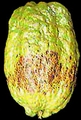 備注:番石榴果實生長過程如發生缺鈣,則果實近底部或底部的外表會出現嚴重的褐色帶狀病斑,由於套袋相對濕度偏高,會導致瘡迦病菌等大氣傳播型的孢子發芽並感染健果。