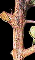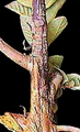 枝條病徵: 枝條新芽生長不良或停頓,且為全株性,此與立枯病僅在受害枝條上出現新芽生長不良可以區分。葉片著生的部位節與節距離縮小,更嚴重者老枝條或枝幹表面會粗糙,表皮因而破裂成溝狀,也有表皮會斷裂呈橫裂而內層產生黑色乾燥等現象。