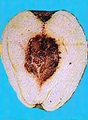 果實病徵: 果實提早成熟,約為正常果的1/2~1/3重量,且提前黃化,觸摸果實表面無堅硬感而呈軟棉狀,果實內部種子無法發育,呈黑色,並可見到由果梗至種子內腔的維管束呈橫狀斷裂。