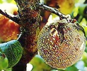 田間枝條上的病果有些因腐爛而掉落,有些則因失去水份而成木乃伊的殭果,有些殭果高懸於枝條上。