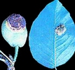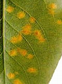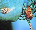 春孢子腔及龍柏上雨後之冬胞子堆(呂理燊、劉達修、王文哲、林正賢,1996,梨病蟲害管理手冊第6頁)