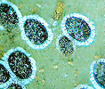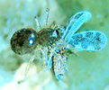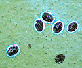 體橢圓形,黑色,四周圍以白色臘質,背面隆起,附生多數長刺,體長約1mm。 |