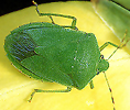 成蟲: 鮮綠色,觸角綠色但先端赤褐色。複眼黑色,單眼赤色。頭部外緣,前胸背側緣、鞘翅前緣基部及稜狀部基部之3小點為黃綠色。腹部背面綠色。體長14~16公厘。