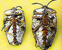 成蟲體長24~28mm,盾形,黃褐色,腹部被有白色蠟粉是其重要特徵,觸角4節。卵近圓球形,長2.6~2.8mm,淡綠色或黃褐色,常14粒相聚成堆。若蟲五齡,末齡若蟲體長18~20