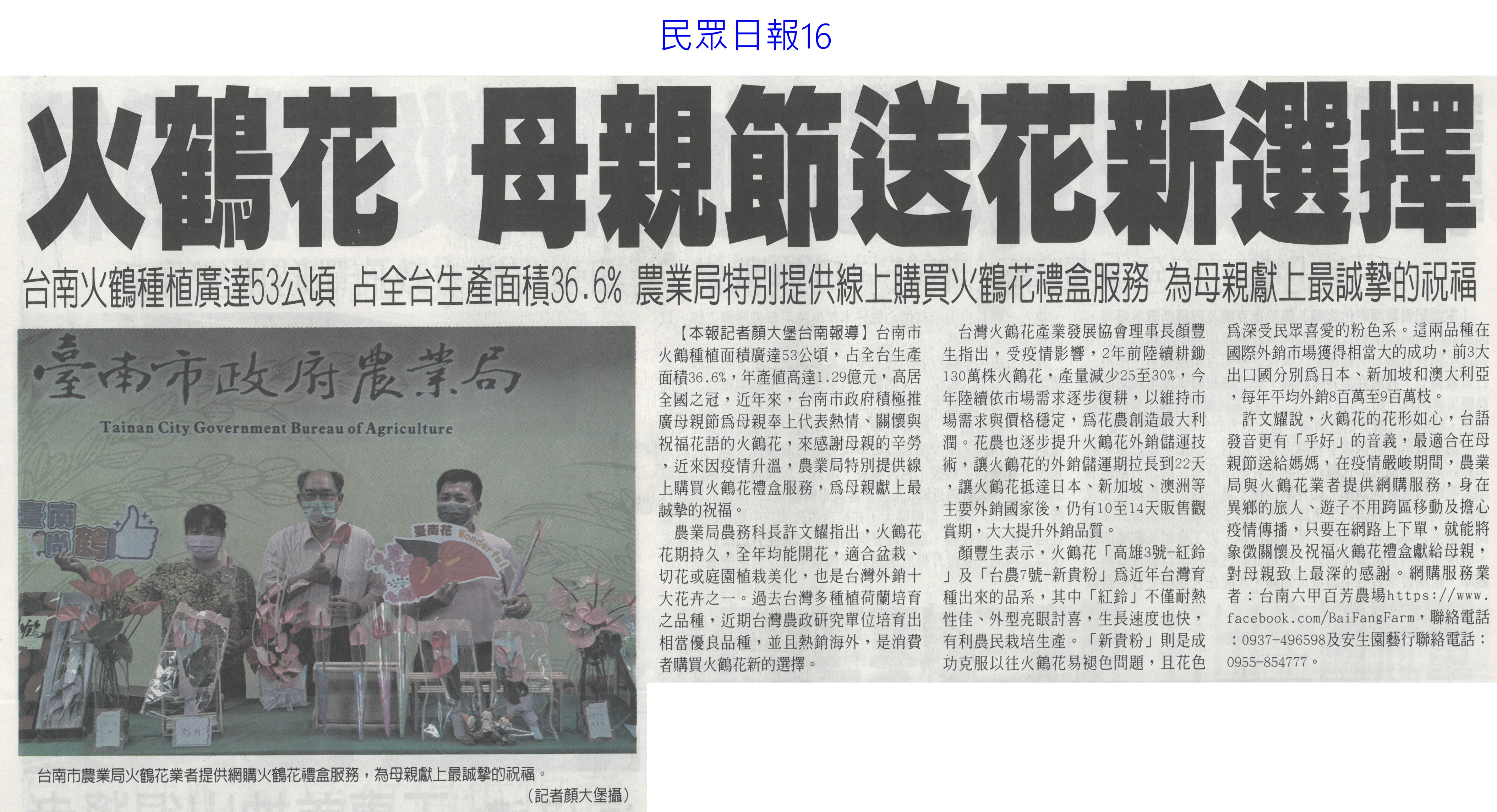 特性:火鶴花產業從民國86年左右開始發展,透過行政院農業委員會台南區農業改良場的技術輔導,積極進攻日本外銷市場,成為台南縣的重要特色產業。