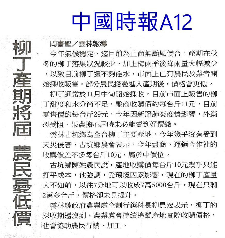 特性:柳丁是多年生的常綠果樹,2月開花,11月底果實成熟,如母親懷胎十月般孕育果實,緩慢的成長過程蓄積許多營養,如蛋白質、糖類、有機酸、粗纖維、無機鹽外,還富含菸鹼酸、維生素B群及維生素C,對人體十分有益。