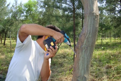 刺桐注射益達胺防治釉小蜂步驟一(鑽孔)