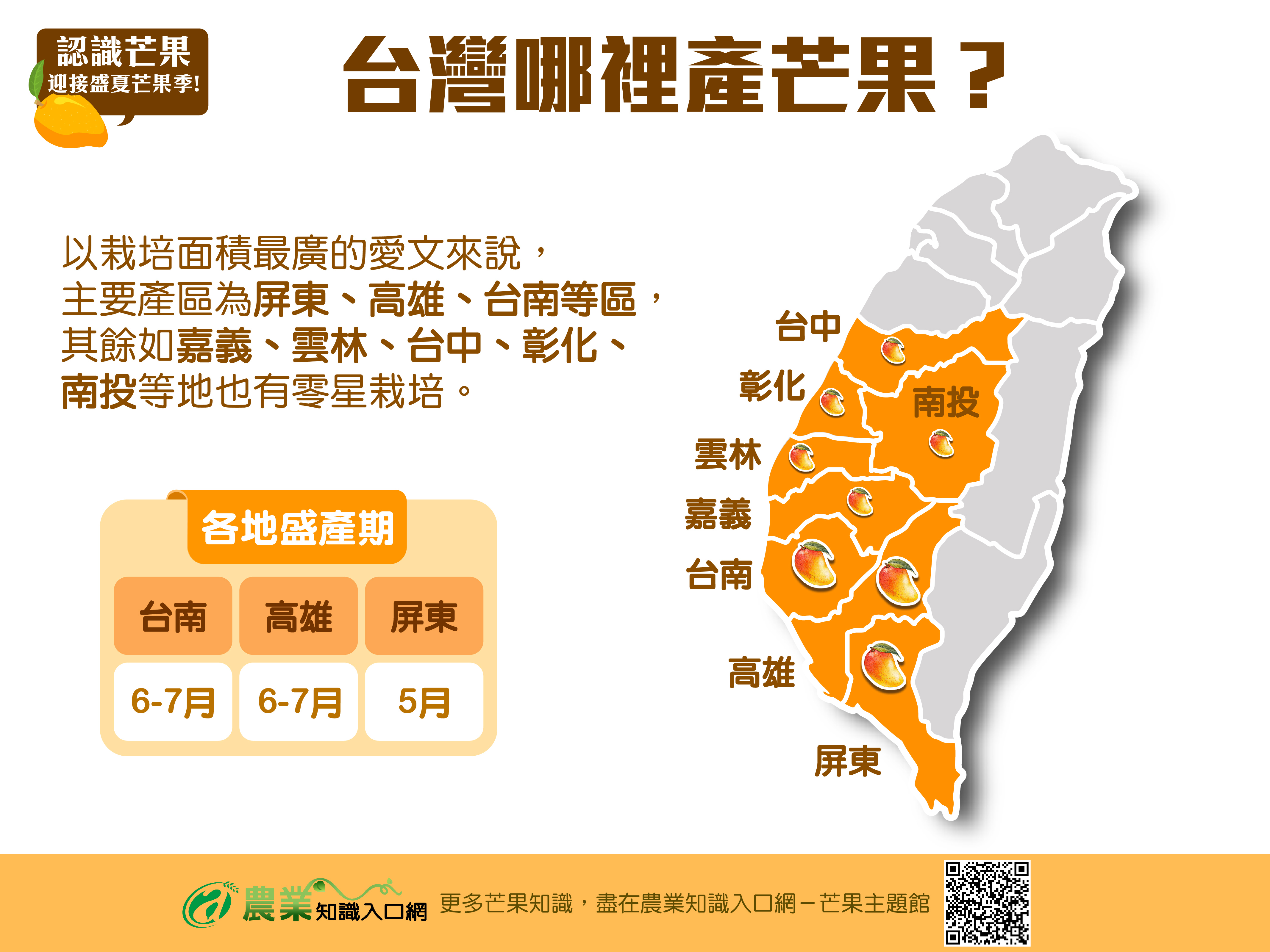 臺灣是芒果聯合國,除了常見的土芒果、愛文、金煌,還有很多不同特色的芒果品種。有龍眼香氣的黑香、香甜可口的夏雪、金蜜,消費者到市場上,可以依照喜愛的品種特性挑選。 近日盛傳芒果有黑點就代表腐敗、不能食用,其實芒果表皮黑點是炭疽病或黑斑病引起對人體並無影響,開始出現黑點也代表芒果已經熟成,可以開始享用,食用時將黑斑部分清除即可。但如果芒果明顯腐敗或有異色異味則就不可食用。 另外,也有許多民眾感到疑惑,臺灣真的有生產這麼多的芒果嗎?芒果產期不是五至七月,為什麼八九月還買得到臺灣芒果?部分品種產期較晚,如凱特芒果產期約在9月;臺灣農友還會利用芒果栽培管理技術延長芒果產期。以美國品種的芒果具有二次開花的特性,像是愛文,農友會在立春摘花,讓果樹開二次花,便可延長芒果採收季節,因此消費者在八月還能吃到香甜可口的愛文芒果。 更多芒果知識,盡在芒果主題館