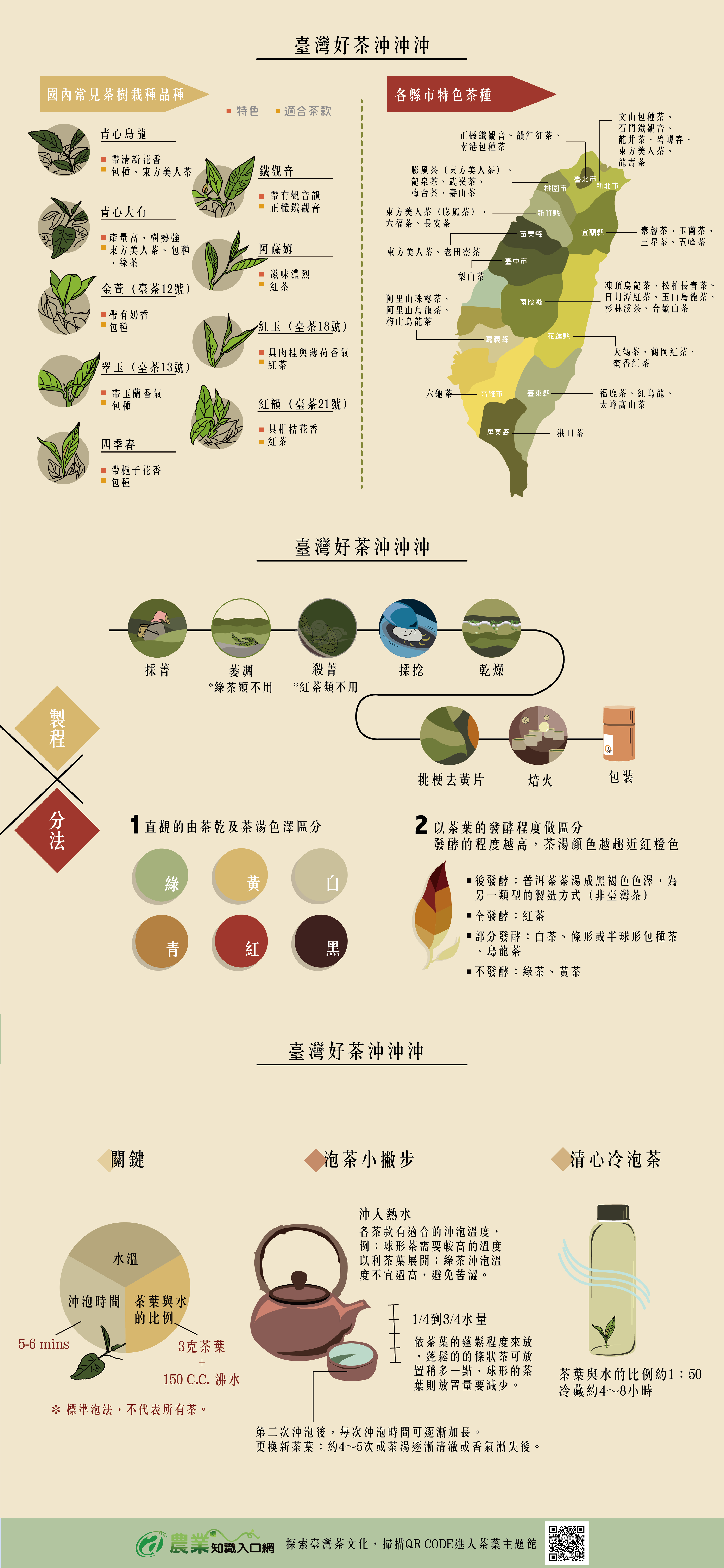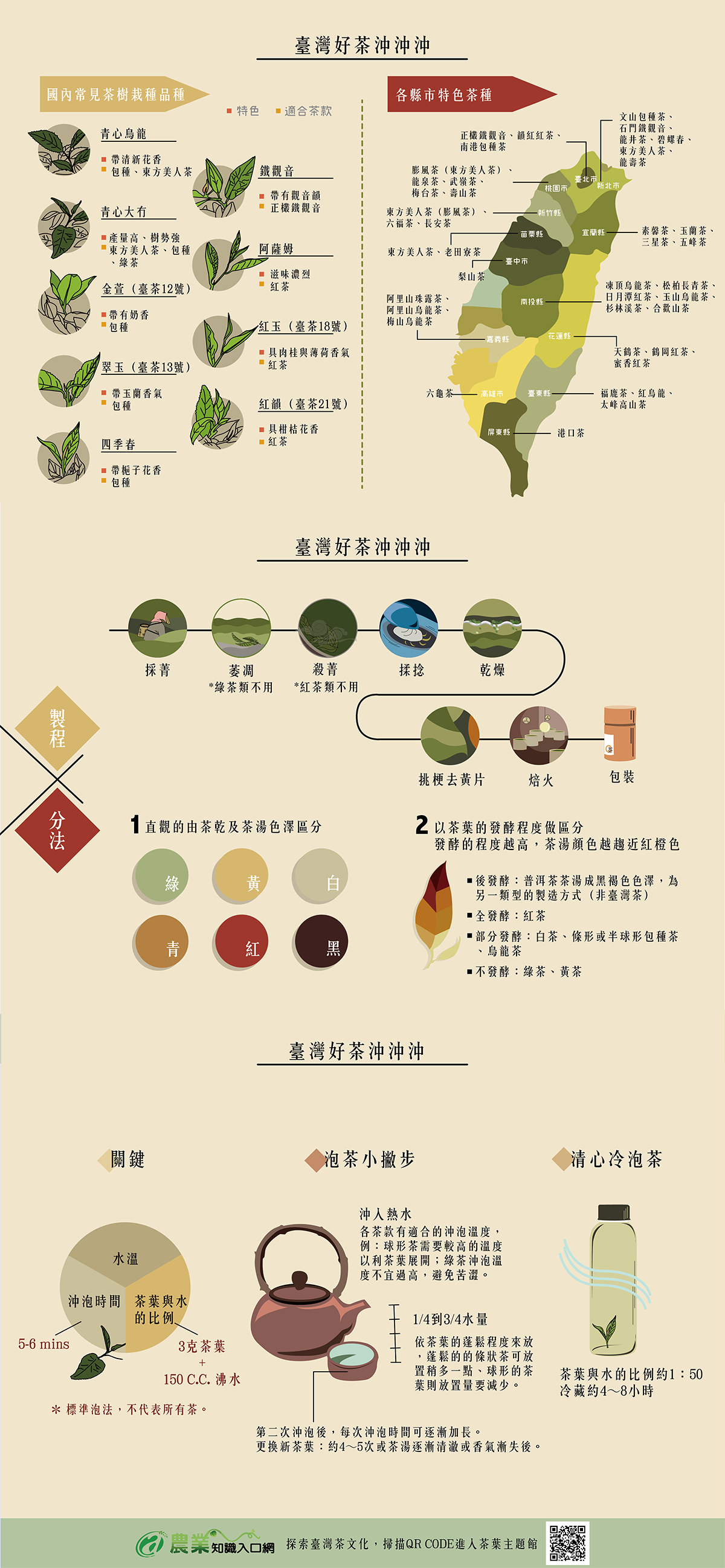 愛喝茶的人,未必就是茶專家。台灣人雖不分男女老少都愛喝茶,卻不一定人人都了解「茶葉」知識。比如,青心烏龍與烏龍茶有什麼差別?金萱、四季春又是什麼?喝起來有何不同呢?金萱、四季春、青心烏龍都是不同茶樹品種的名字,消費者在市面上買到的綠茶、紅茶、烏龍茶與包種茶,則是依製茶工序不同而分的茶款。每種茶樹品種都有其特性,如金萱帶有奶香、翠玉、四季春分別帶有玉蘭花香與梔子花香不同香氣,而運用不同茶種與製程製作出的各款好茶,讓民眾在選擇茶品時能有更豐富多元的選擇。