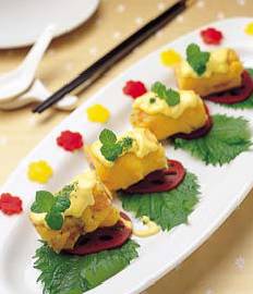 (2) 薑、蔥切絲,鮭魚切片,和蝦仁、蔥絲、薑絲一起包起,用酥醬炸至金黃色排盤。