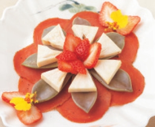 作法:1. 釋迦去外皮,切成三角狀,火腿切片,草莓洗淨剖半。