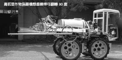 此外,噴桿具水平調整功能,作業上除可應用於一般之低莖作物外,配合可翻轉懸垂噴桿之加裝與行走動線之規劃預留,更可因應高莖作物與棚架栽培作物的病蟲害防治作業需求。