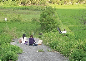 遊程從瀑布順著產業道路而下,巧遇台北來的一群畫室成員,自早上5點開始作畫至今已2~3小時,除臨摹寫生亦徜徉於大自然中,他們是真正懂得生活的業餘藝術家,或新近雅士名之的「樂活族」,可以約集同好至不定點處消磨一個禮拜,人生的選擇其實也可以很簡單。