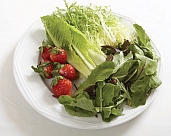材料:新鮮綠捲鬚生菜1小把、新鮮草莓5顆、小番茄6顆、新鮮綠色生菜少許