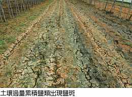 一般而言,設施栽培時農民均以露天栽培同量肥料施用,由於缺少雨水的淋洗,即使有灌溉措施,也常因灌溉量不足以把可溶性鹽類淋洗到較深的土層。此外,設施中的溫度常高於設施外之溫度,因此蒸散發量較大,可溶性鹽類不但不往下淋洗,反而會隨著水分的蒸發由底土經由土壤的毛細管作用往上移動至表土,造成可溶性鹽類在表土累積。另外,因作物生長期縮短,同一塊田種植的期作數明顯增加,肥料之投入量相對提高,鹽分累積問題更加嚴重。