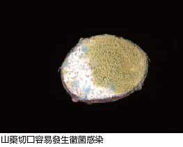 由於長形山藥塊莖較長,為了配合禮盒包裝的需要,往往需將塊莖截為數段,造成山藥塊莖上的傷口,十分容易導致山藥切口處產生發黴現象。傳統上對於山藥切口處理之方式,例如以電風扇吹乾切面後包裝等,無法直接有效阻絕黴菌。此外,市售山藥禮盒甚至可能因包裝材料不同而影響包裝內部濕度,反而加速黴菌的生長繁殖。