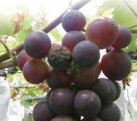 葡萄晚腐病:主要危害果實,且感染任何發育期的果實,初期出現黑色細點,隨後呈網紋狀圓斑,接著病斑中央轉黑色凹陷,天氣濕熱時造成果粒的軟腐,並造成裂果流出汁液;天氣乾熱時則乾扁如葡萄乾狀。高溫多濕與清園不良是造成本病猖獗重要原因,因此在栽培管理上要注意清園整枝,儘量使枝條平展,葉片互不重疊,保持良好採光通風。
