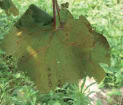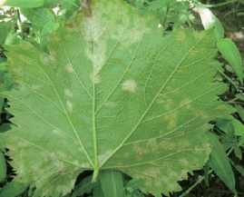 葡萄露菌病:可危害葉片、新稍花穗及果梗。發生於多濕時期,被害葉之葉背呈現白黴狀或呈角斑,後者中間部轉褐色,病斑多時易引起落葉,花穗被害時呈水浸狀,使其無法結果,危害果梗使果粒脫落。建議農民用藥時機,夏果可自花期開始用藥,冬果則於萌芽後約 3 個展開葉時便開始用藥。