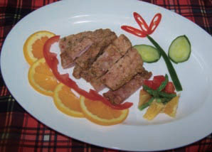 6. 把作法5醬汁淋在作法3的里肌肉上,以切片的牛番茄裝飾,即可享用。
