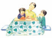 冬天的樂趣是一家人圍著有暖爐的桌子,一邊把雙腳伸入暖爐,一邊吃橘子。