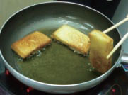 2. 包夾好吐司片要入鍋油炸時,可先用竹籤、長牙籤固定,以免遇炸爆開而散形。
