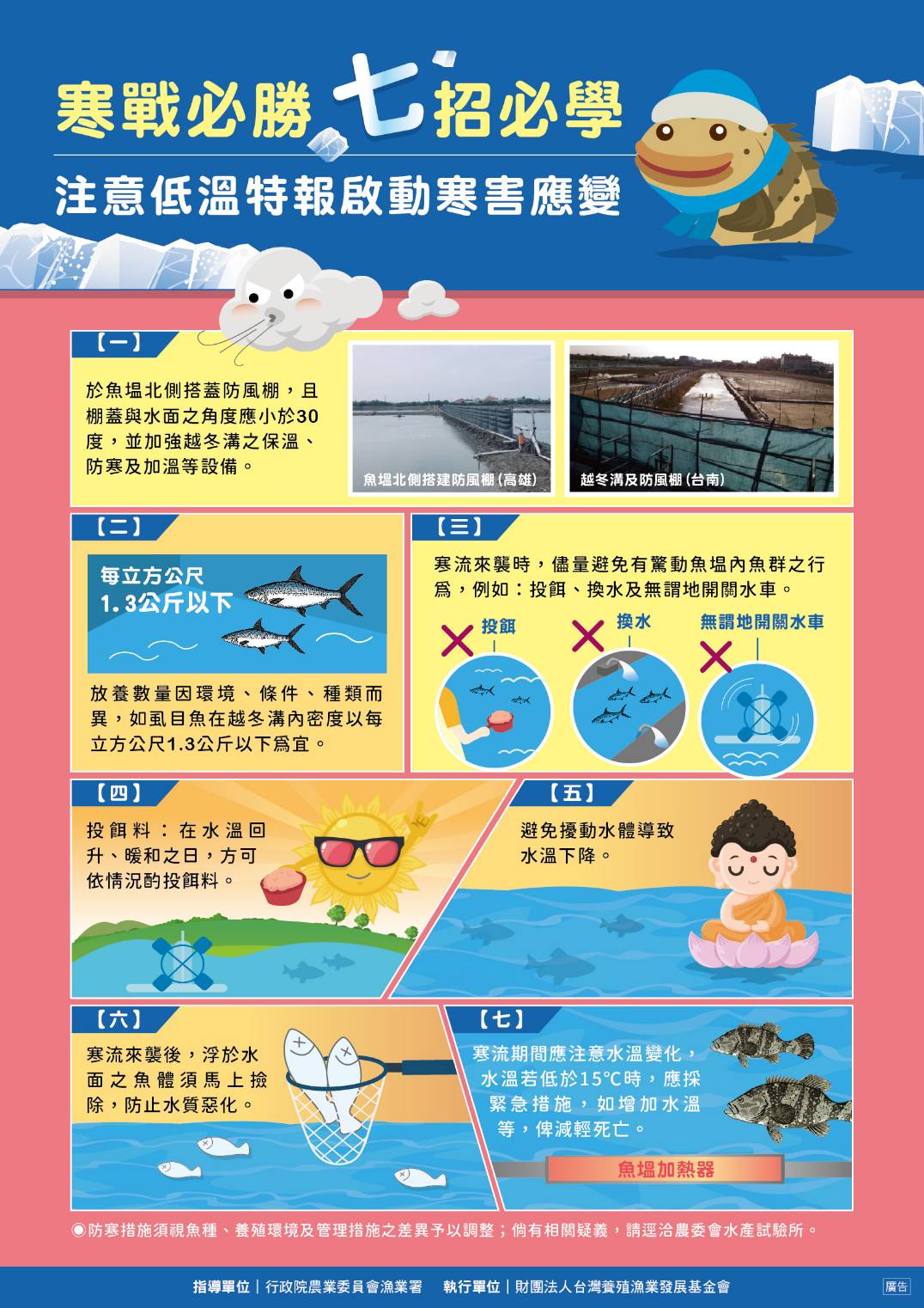 漁業署特別籲請養殖業者加強寒害防範措施如下:一、於魚塭北側搭蓋防風棚、加深水深,加強越冬溝之保溫、防寒及加溫等設備。二、低溫期間儘量避免擾動水體或驚動魚塭內魚群,應暫停投餌及不要無謂地開關水車。三、在氣溫回升、暖和之日,視情況再酌投飼料。四、低溫侵襲或留滯時,應注意水溫降低之速度,水溫若低於15℃時,應採緊急措施,如加溫以提高水溫,俾減輕死亡。五、必要時規劃儘早採捕,以減少寒害損失。六、低溫與寒流過後,浮於水面之魚體應馬上撿除,防止水質惡化。