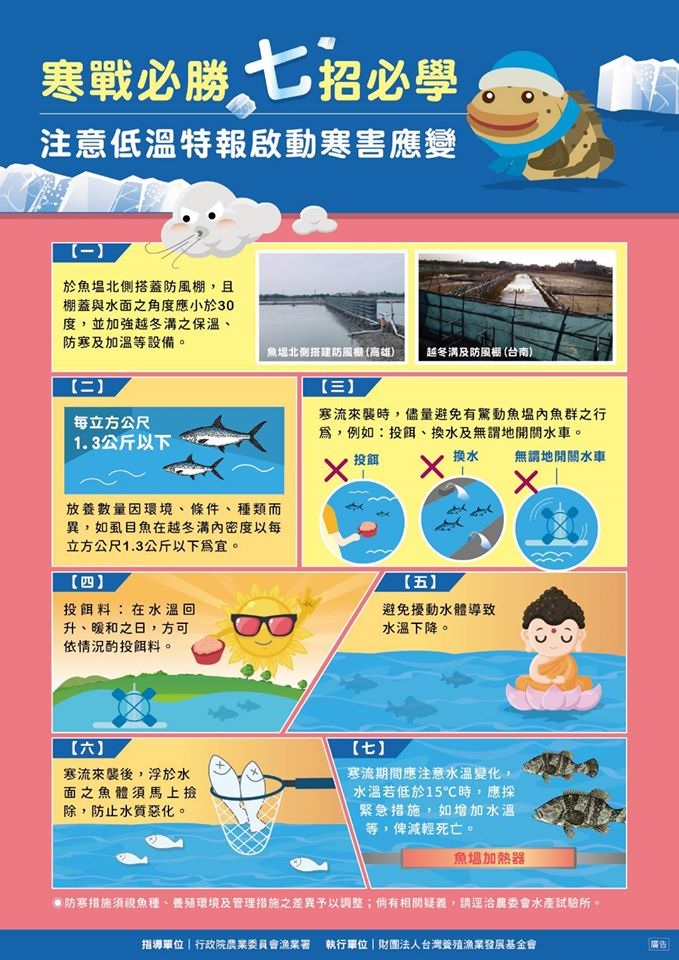 漁業署特別籲請養殖業者加強寒害防範措施如下:一、於魚塭北側搭蓋防風棚、加深水深,加強越冬溝之保溫、防寒及加溫等設備。二、低溫期間儘量避免擾動水體或驚動魚塭內魚群,應暫停投餌及不要無謂地開關水車。三、在氣溫回升、暖和之日,視情況再酌投飼料。四、低溫侵襲或留滯時,應注意水溫降低之速度,水溫若低於15℃時,應採緊急措施,如加溫以提高水溫,俾減輕死亡。五、必要時規劃儘早採捕,以減少寒害損失。六、低溫與寒流過後,浮於水面之魚體應馬上撿除,防止水質惡化。