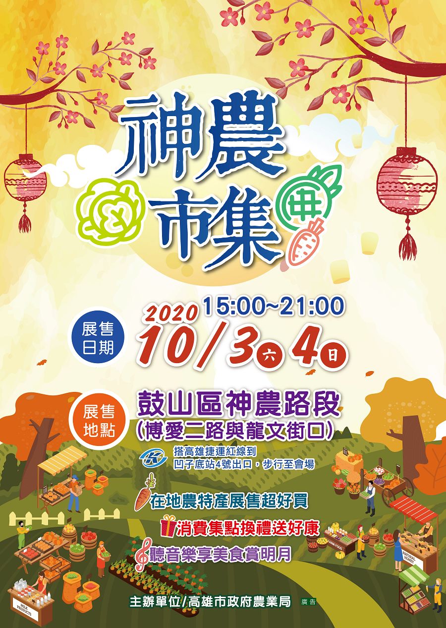 中秋假期還沒想好要去哪裡逛逛嗎?高雄市政府農業局將在本周末10月3日及10月4日於博愛路凹仔底捷運站旁舉辦「神農市集」農特產品展售活動,為了推廣南台灣在地優質農特產品,高雄市政府農業局舉辦了「神農市集」農特產品展售活動,除了讓小農們能將最新鮮的物產直接呈現給消費者外,更是打造出一個讓小農們與消費者零距離互動的銷售平台。