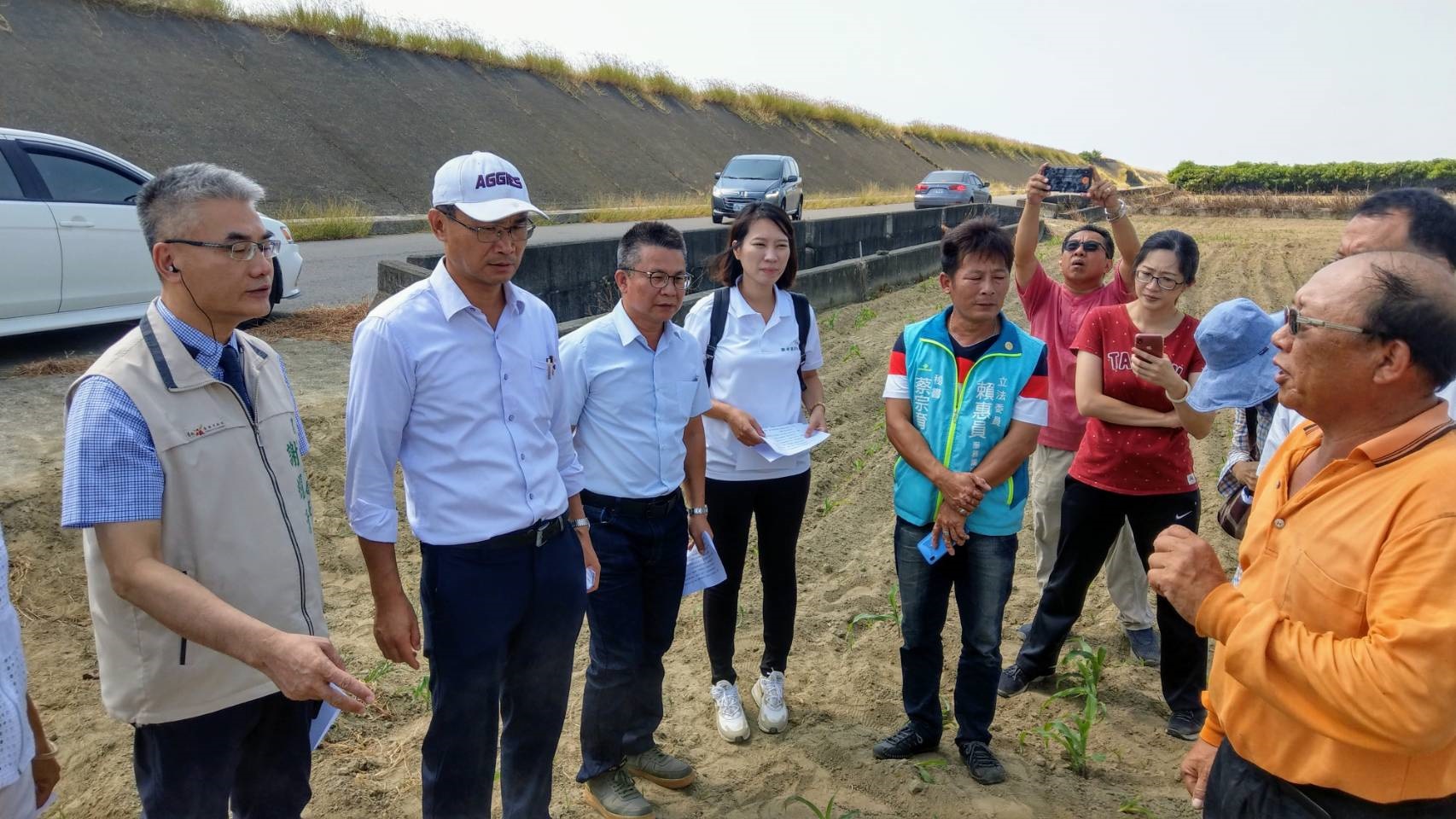 陳主委一行聽取台南區農業改良場朴子分場游添榮分場長說明乾旱及玉米生長情形,游分場長表示,義竹及鹽水地區硬質玉米,於9月定植後久未下雨,表土含水量相當低,已影響根系生長。陳主委表示,勘查田區乾旱情形嚴重,田區確有發芽率不佳及缺株情形,目前各地區陸續定植,請改良場及地方政府持續關注後續天候及生長情形,並請基層公所查報災情,後續依救助辦法規定辦理相關現金救助工作。