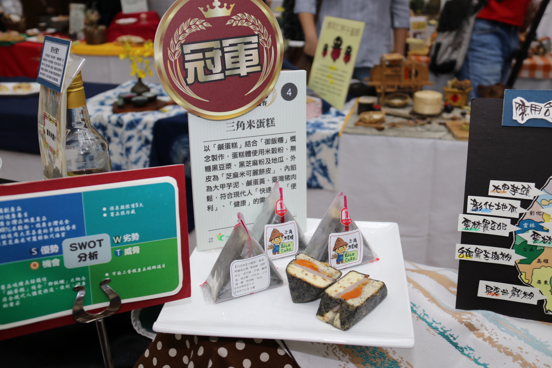 農糧署為鼓勵高中職學生重視米食文化及營養,辦理「2020非米不可創意米食競賽」,以國產米及米穀粉為主要食材,搭配在地農特產品製作創意米食料理,吸引全臺27所學校,計60組高中職學校餐飲菁英報名參賽。這些料理界的明日之星展現出充沛的研發創新能量,加上開發新型態米食的巧思讓評審團隊感到驚艷。在眾多高手競爭下家齊高中蔡東佑、蔡玟蕙同學以快速、好攜帶和方便為出發點,結合鹹蛋黃和御飯糰概念,研發出「三角米蛋糕」勇奪金牌並獲10萬元獎金。