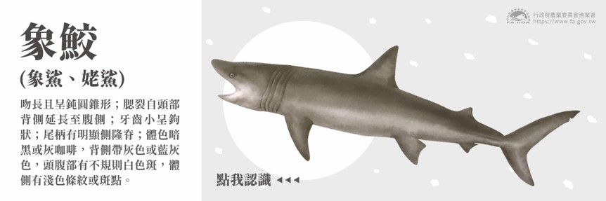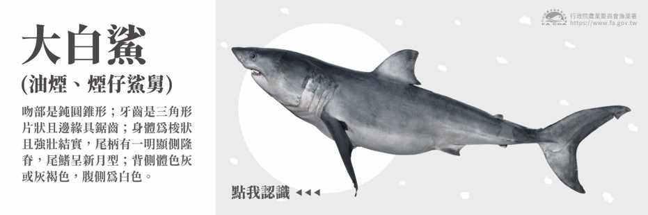 為維護我國沿近海大白鯊、象鮫及巨口鯊等物種資源,自109年11月10日起禁止捕撈大白鯊、象鮫及巨口鯊,意外捕獲時應立即放回海中,並於返港時主動通報漁獲資訊。