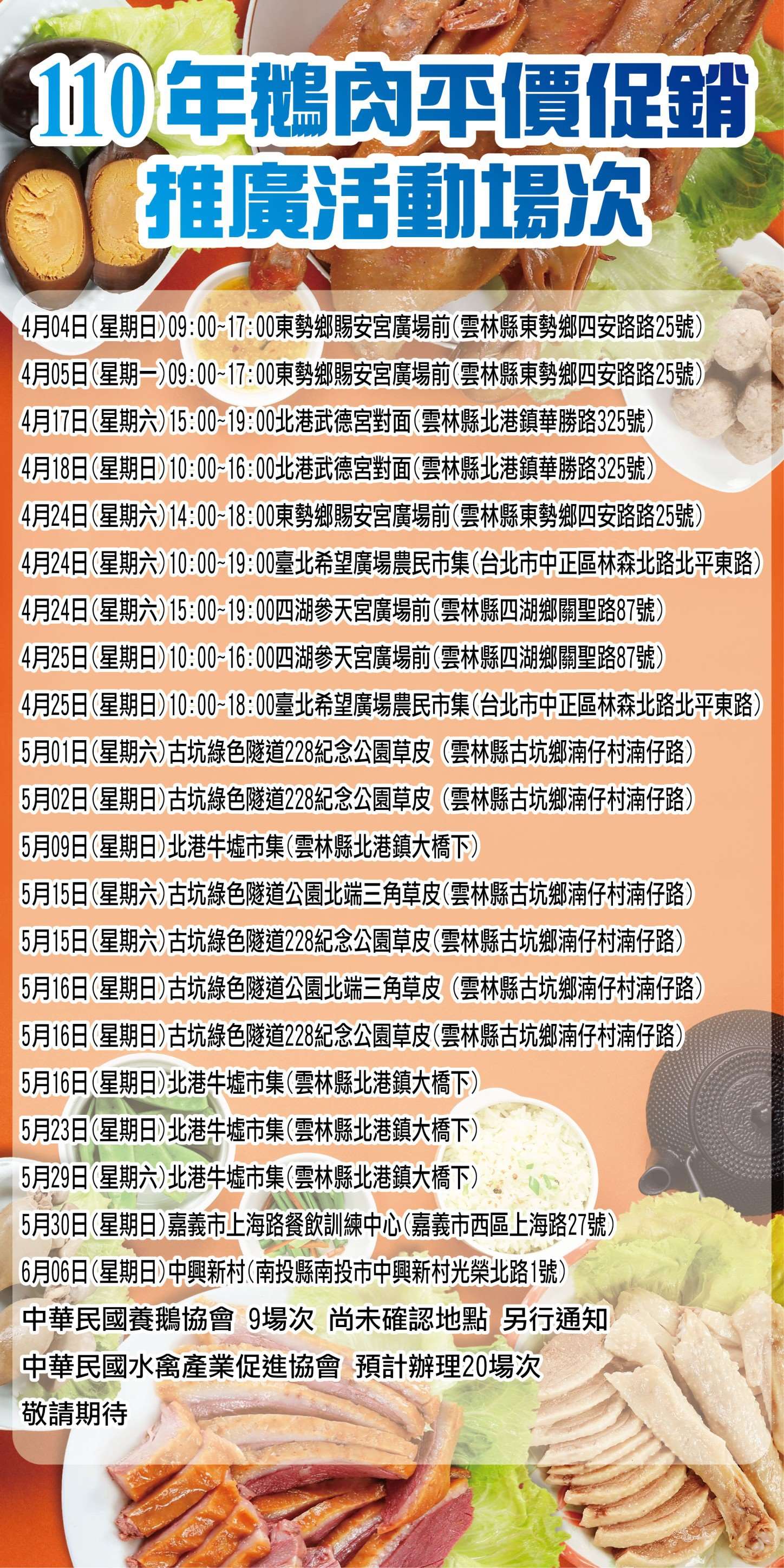農業處強調,目前正值鵝肉肉質最鮮美肥嫩的季節,是夏季涼補的最佳選擇,加上各業者均端出更多的創意料理,這個夏季大家可以呷鵝肉,呷到鵝樂!今年度的50場國產鵝肉平價促銷活動,目前已辦理4場次,民眾反應十分熱烈,接下來的場次促銷活動優惠更多,請大家多多把握。