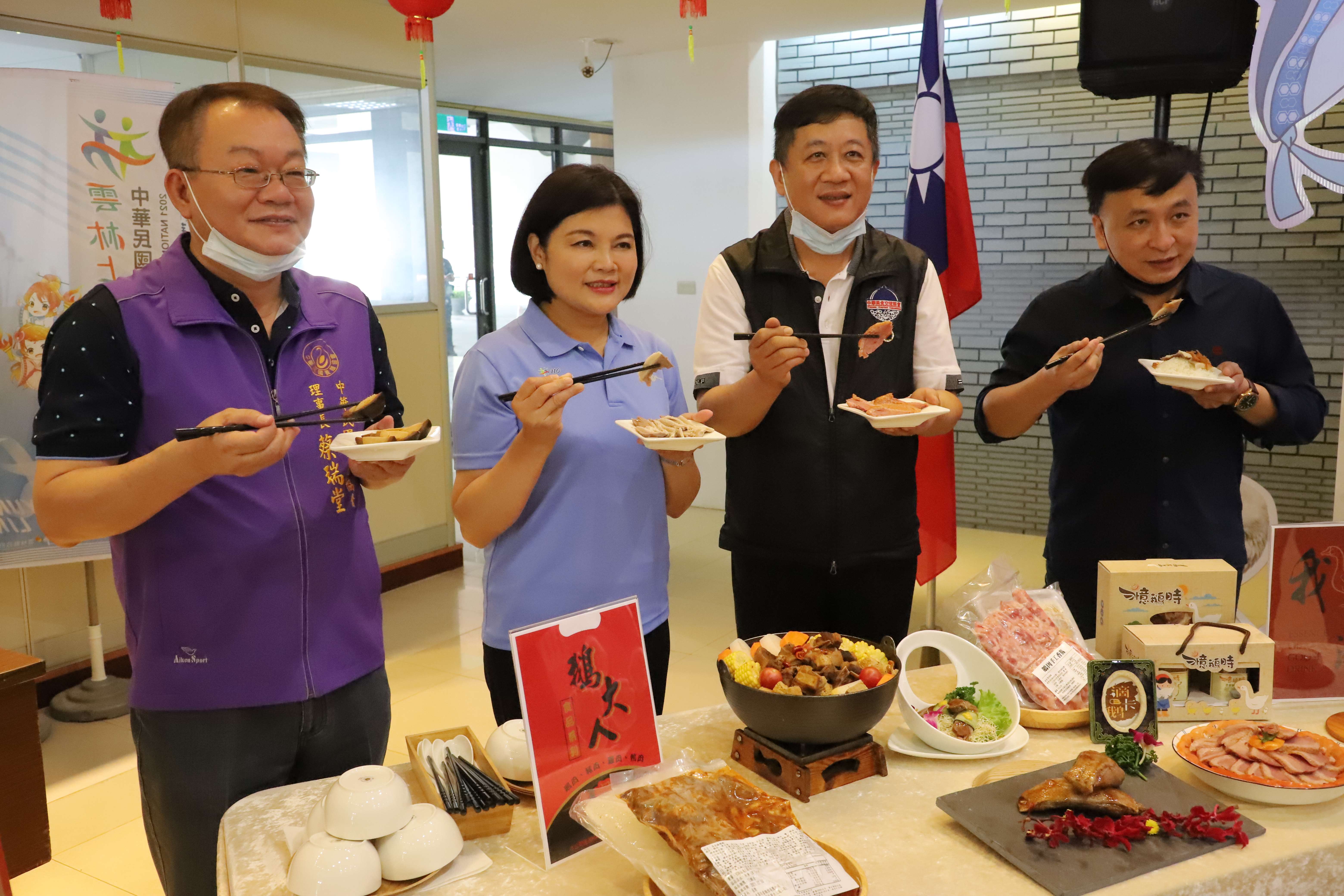 雲林縣政府今年度將與中華民國養鵝協會及中華民國水禽產業促進協會共同辦理50場國產鵝肉平價促銷活動,本周六、日(4/24、25)分別在東勢賜安宮、四湖參天宮及臺北希望廣場登場,今天舉行記者會宣傳,雲林縣長張麗善、中華民國養鵝協會理事長蔡瑞堂、中華美食交流協會理事長郭宏徹、中華民國水禽產業促進協會秘書長段志正邀請民眾踴躍參加,一起來品嚐美味的鵝肉料理。