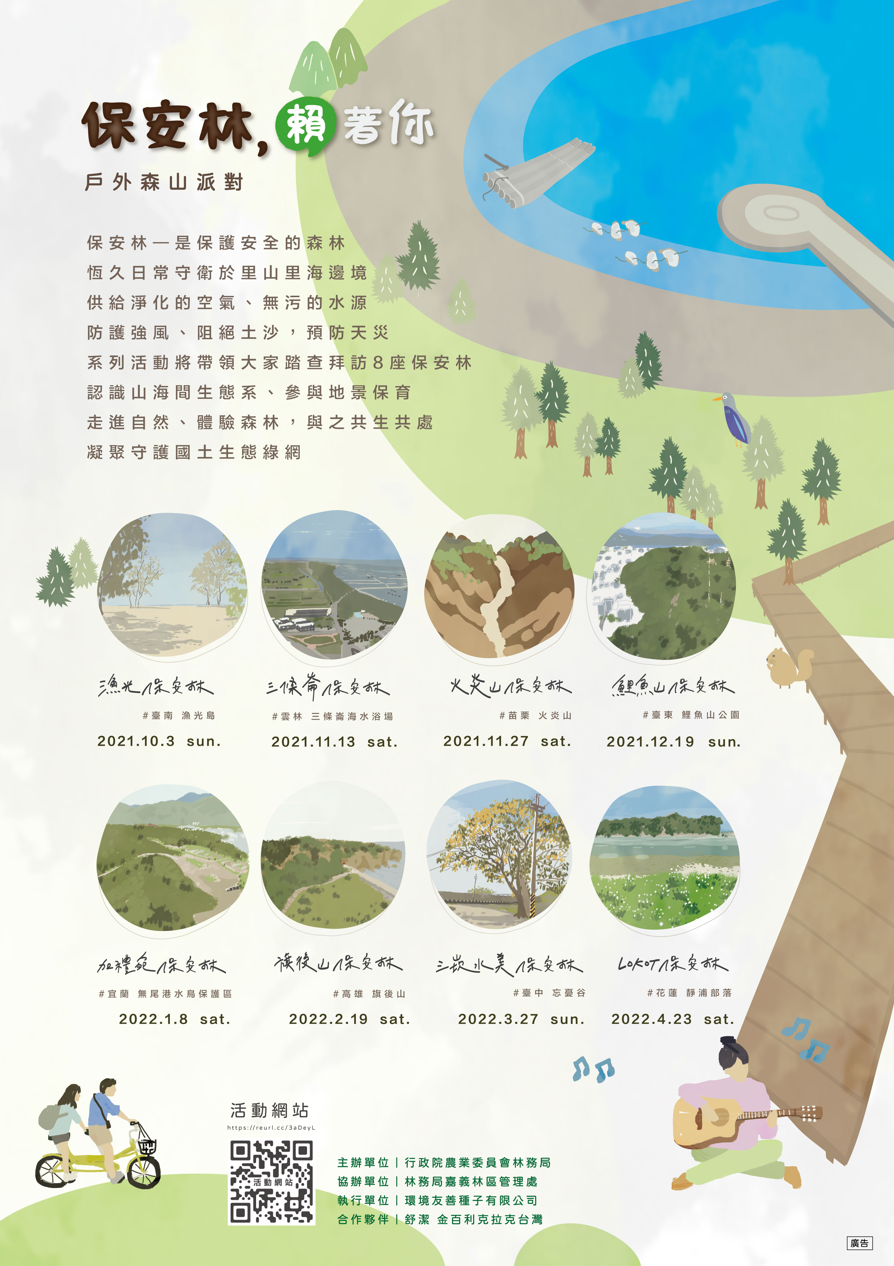 體驗活動即日起開放報名,定時導覽3場次,堆砂籬體驗1場次,每場次限額30人,額滿為止。詳情請見活動網站(https://reurl.cc/3aDeyL),並隨時關注林務局森活情報站臉書粉絲頁(https://www.facebook.com/twforest )或電話洽詢(02)2368-0603#18。