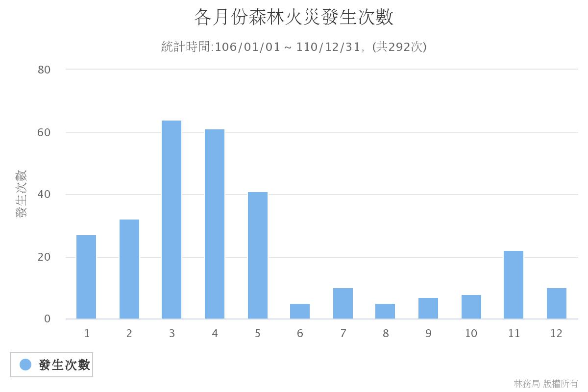 林務局指出,106-110年間臺灣每年平均發生58.4起森林火災,平均森林被害面積約40.14公頃,致救災人員疲於奔命及造成森林資源損失,又歷年森林火災事件發生原因,研判有97%是人為因素所引起。為主動提醒進入高風險地區之民眾防災意識,農委會林務局運用災防告警細胞廣播機制,當特定地區連日高溫乾旱、森林底層林下燃料極度乾燥時,即主動發布森林火災警報至當地民眾手機,提醒民眾應謹慎用火、避免任何引火行為,「不」燃燒雜草、「不」亂丟菸蒂、「不」隨地焚燒垃圾等,避免森林火災發生。